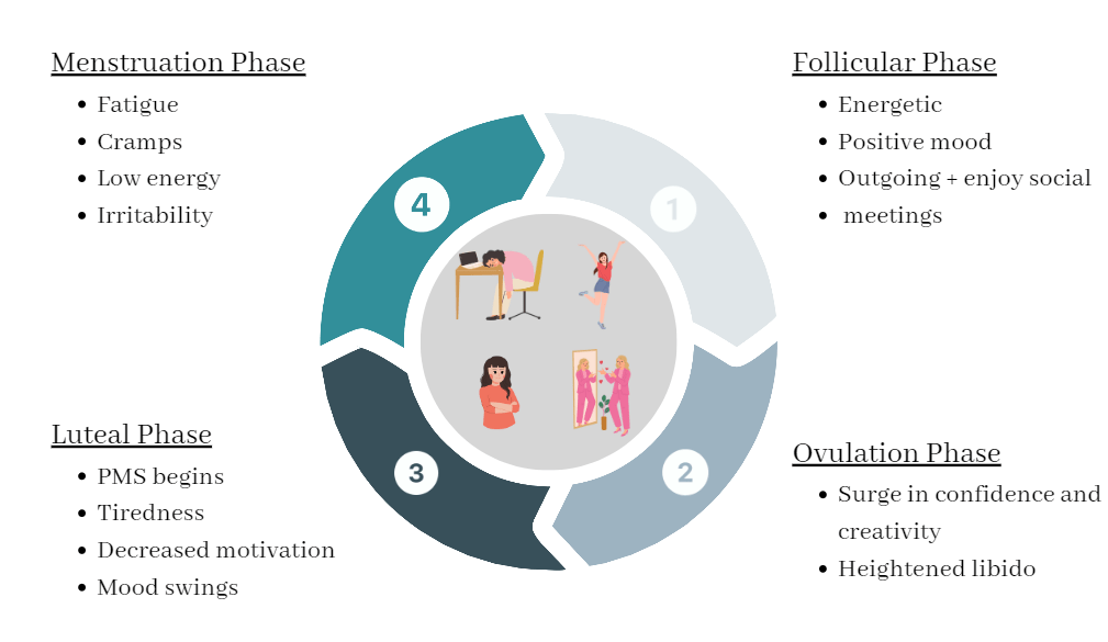 This monthly cycle can influence productivity due to hormonal fluctuations impacting energy levels, mood, and cognitive function (see below). These hormonal fluctuations can impact cognitive functions such as memory, concentration, and decision-making, potentially affecting productivity. Understanding these patterns can help us manage our energy levels, workload, and self-care practices more effectively throughout the menstrual cycle.