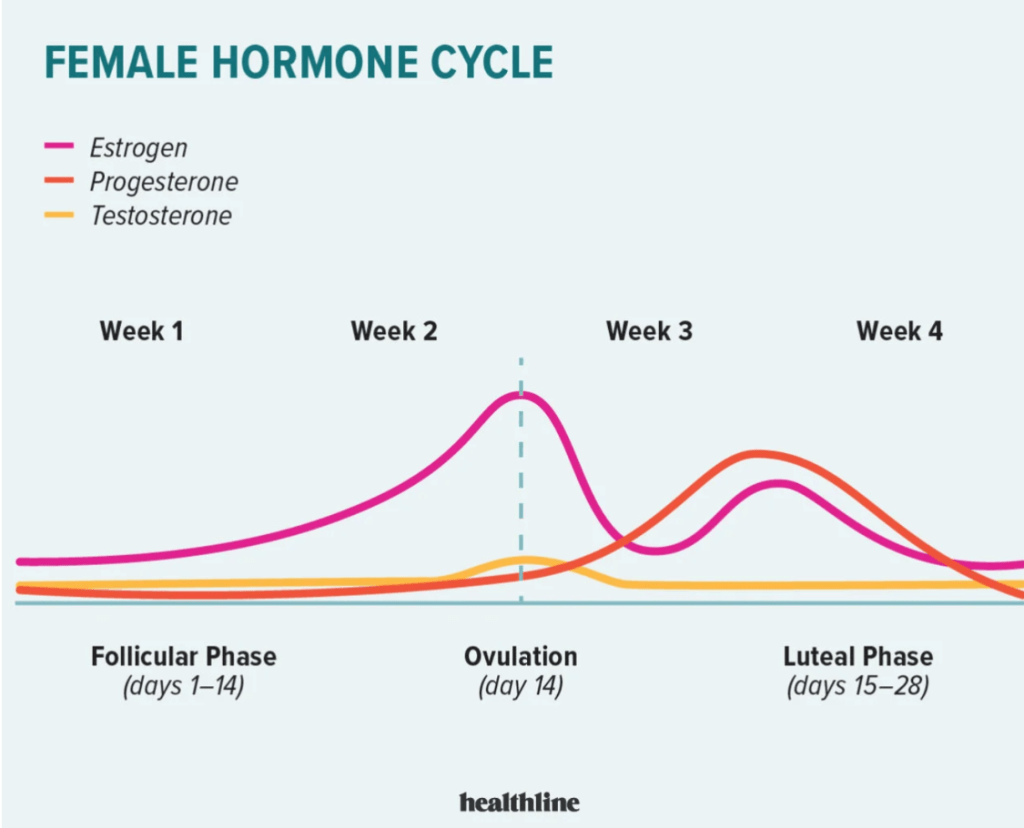 In the follicular phase, there’s a notable surge in progesterone and oestrogen levels. Testosterone remains relatively stable, though it may increase toward the phase’s end.